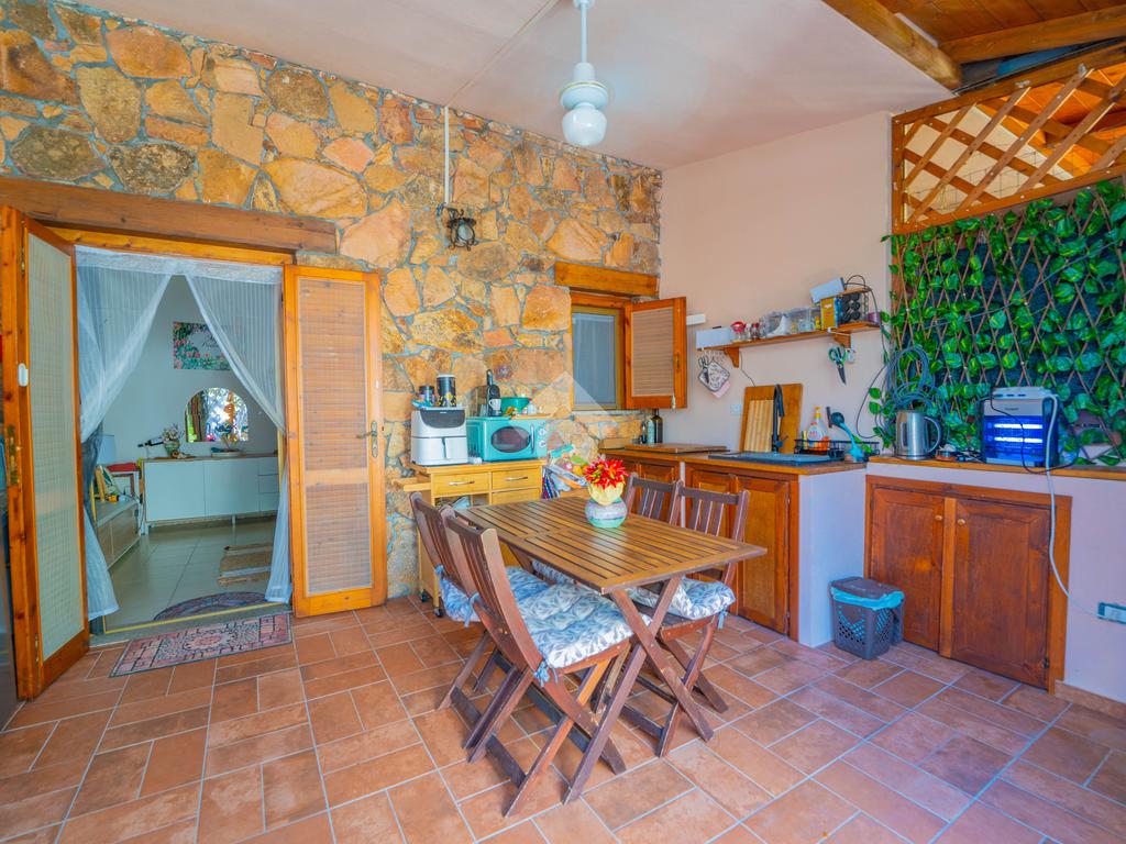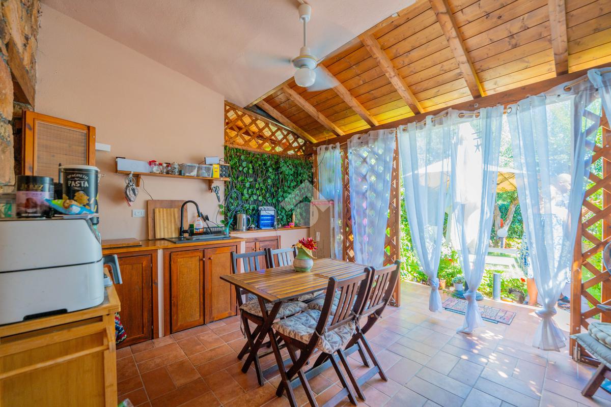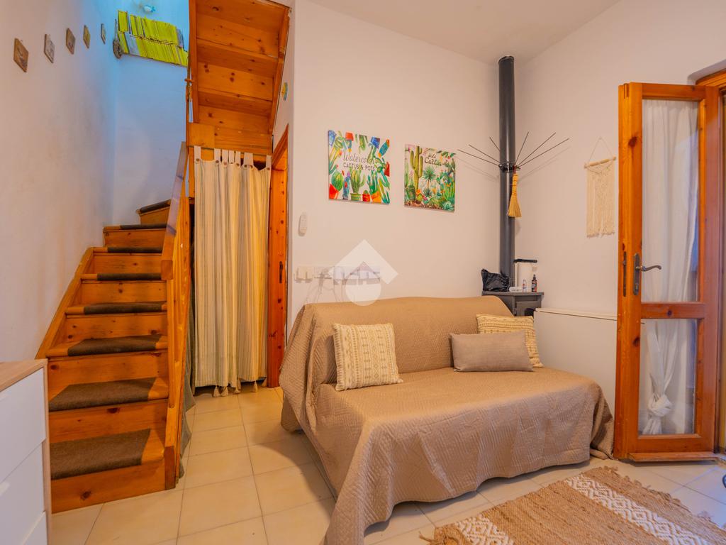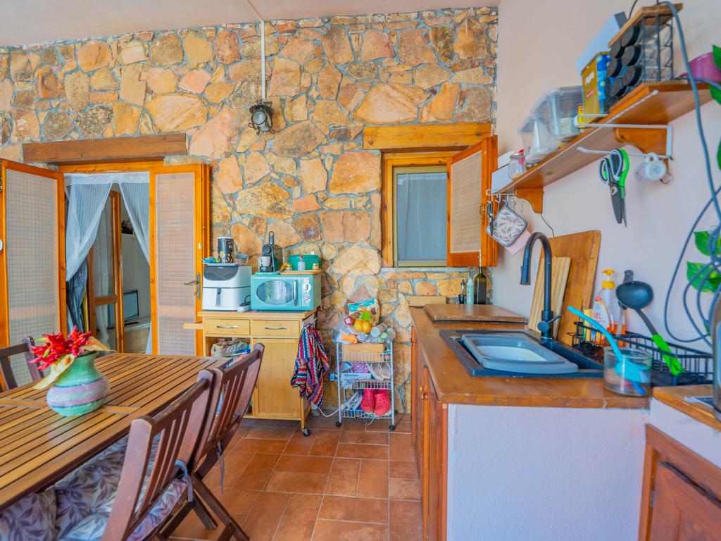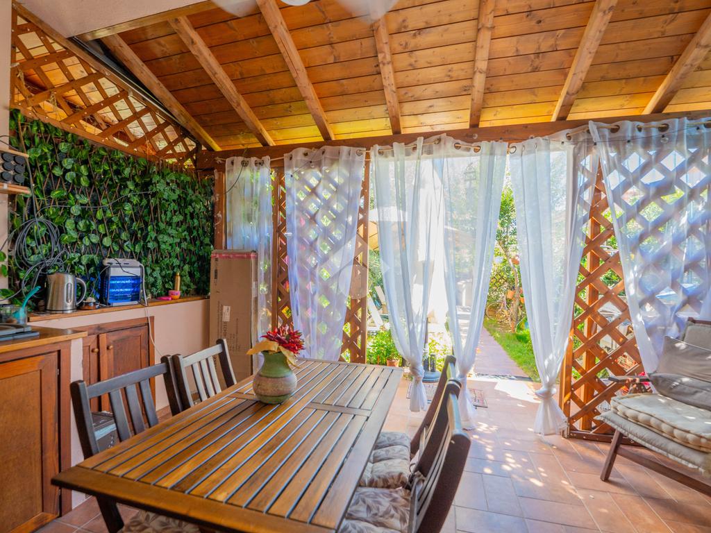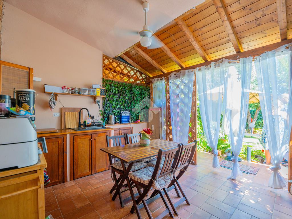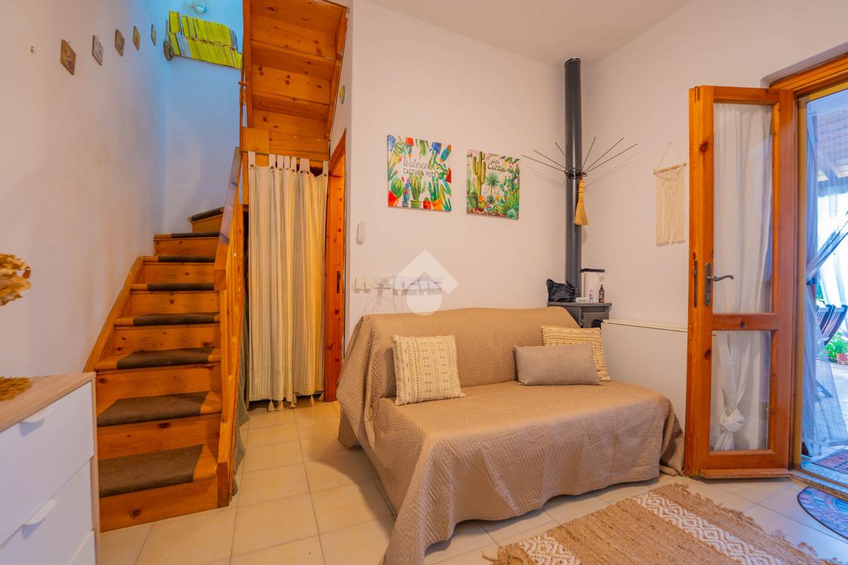 Dal giardino si accede alla veranda esterna dove la proprietà ha realizzato la zona cottura, così da destinare l'interno alla zona notte. Dalla veranda si accede all'interno dove è presente un divano letto ed un bagno sullo stesso livello, mentre una scala interna conduce alla camera da letto disposta al piano superiore.