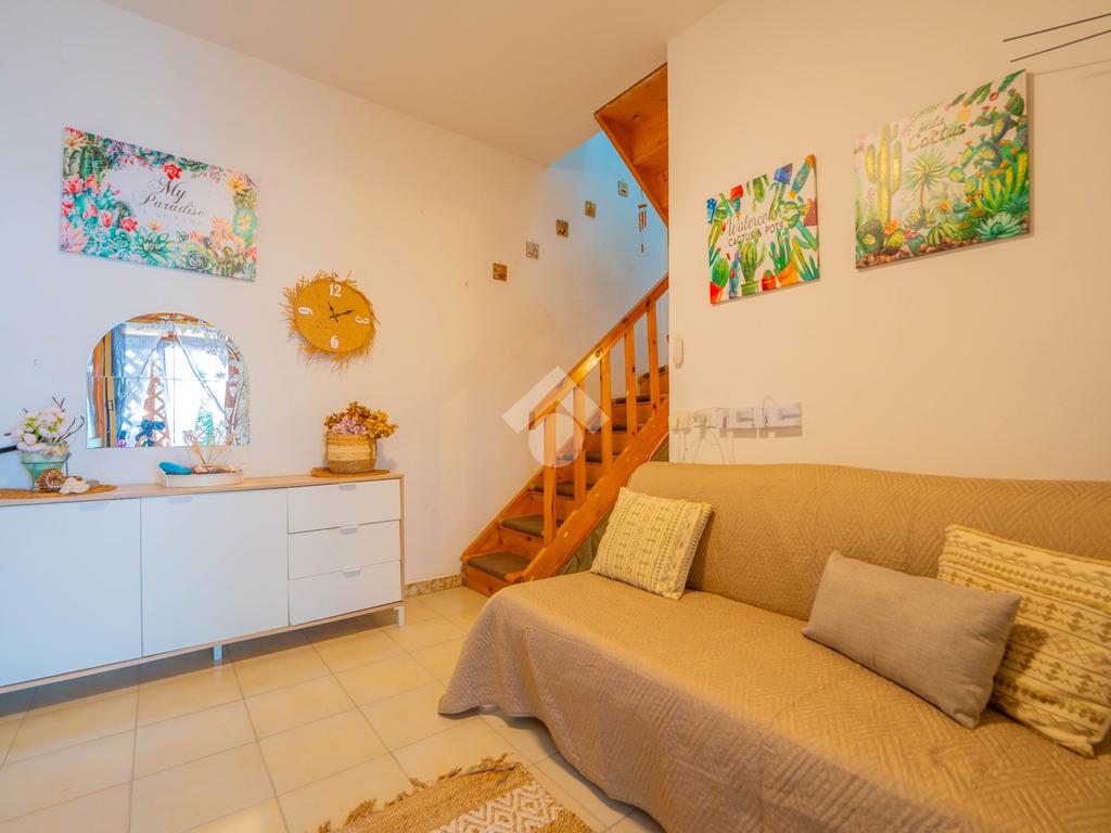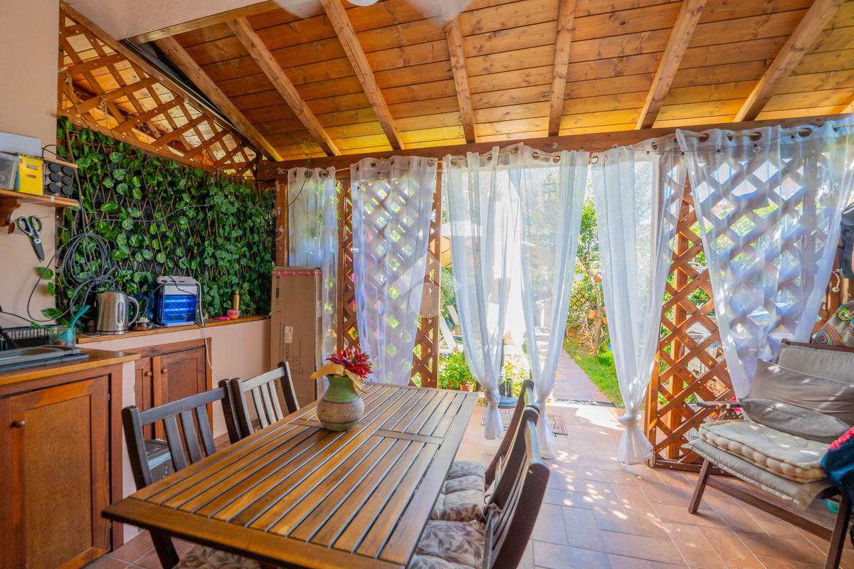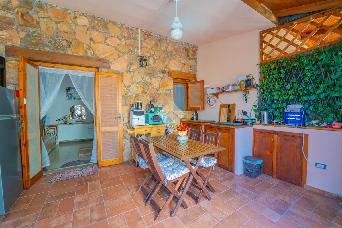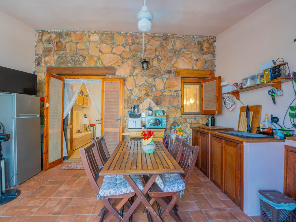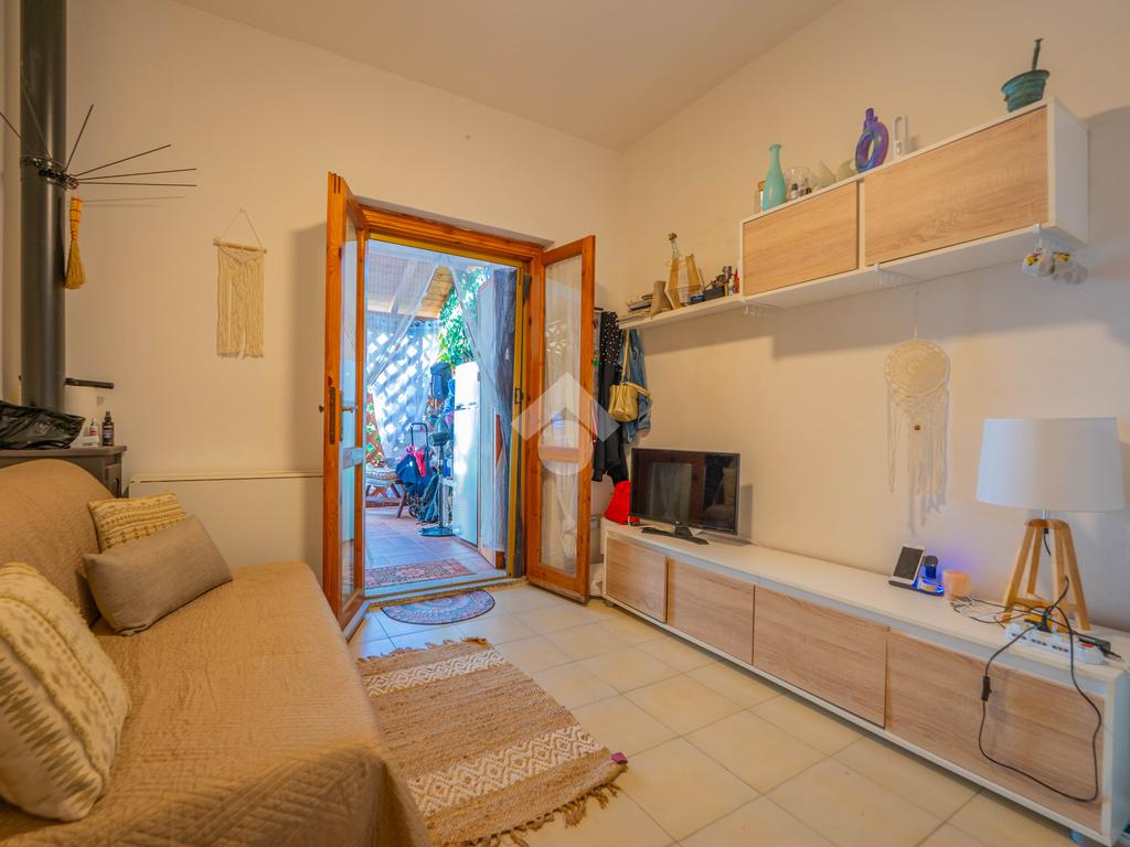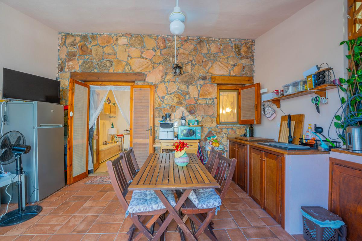 Dal giardino si accede alla veranda esterna dove la proprietà ha realizzato la zona cottura, così da destinare l'interno alla zona notte. Dalla veranda si accede all'interno dove è presente un divano letto ed un bagno sullo stesso livello, mentre una scala interna conduce alla camera da letto disposta al piano superiore.