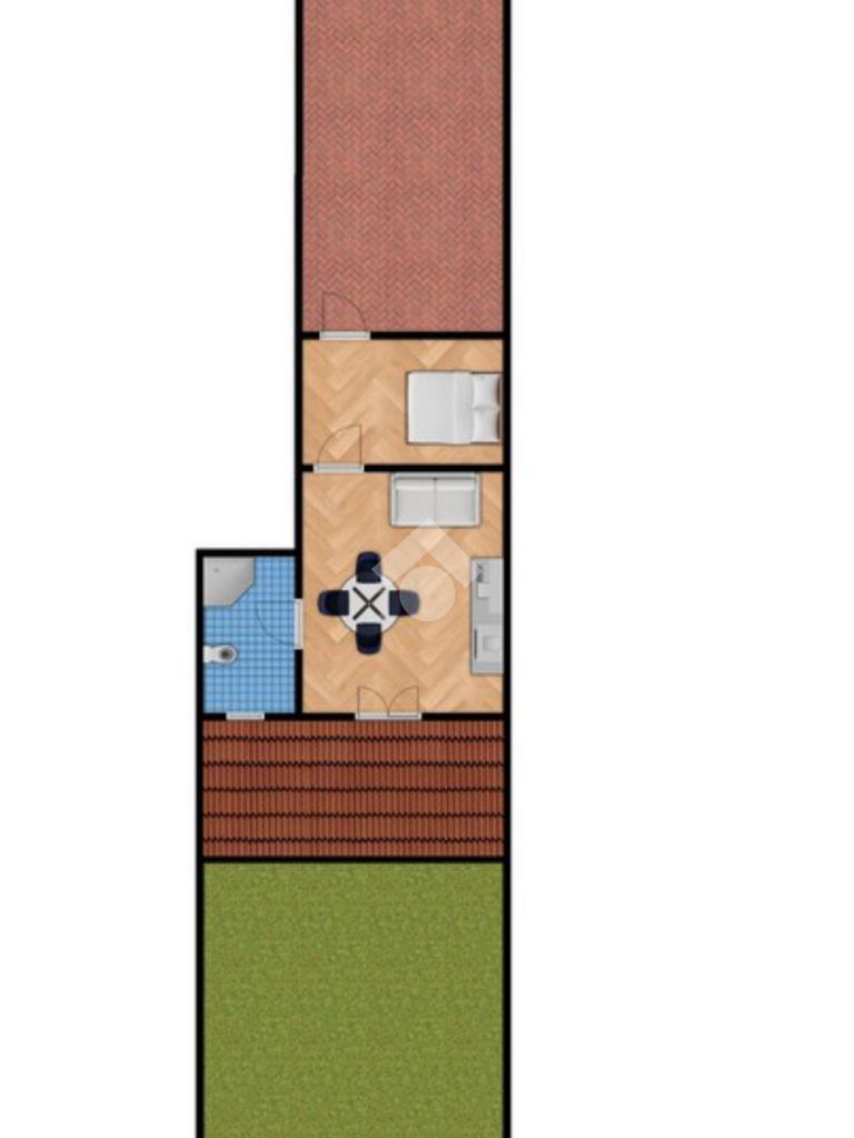 Questa villetta a schiera e’ sviluppata su unico livello e presenta un doppio ingresso indipendente: uno sul fronte e uno sul retro della casa. Il giardino è in parte piantonato ed utilizzabile per le più svariate esigenze, è attrezzato di barbecue e termina con un’ampia terrazza coperta e vivibile.